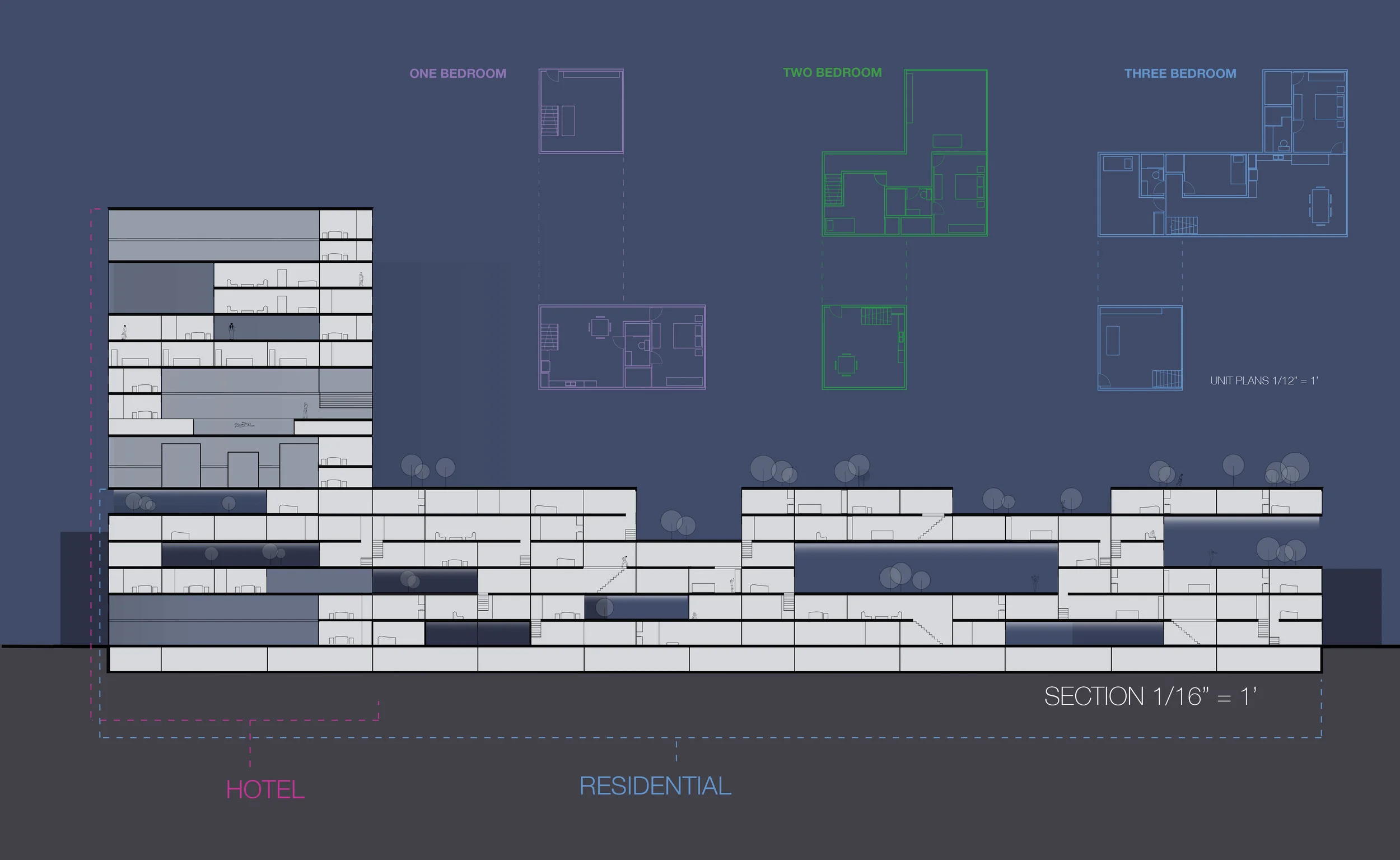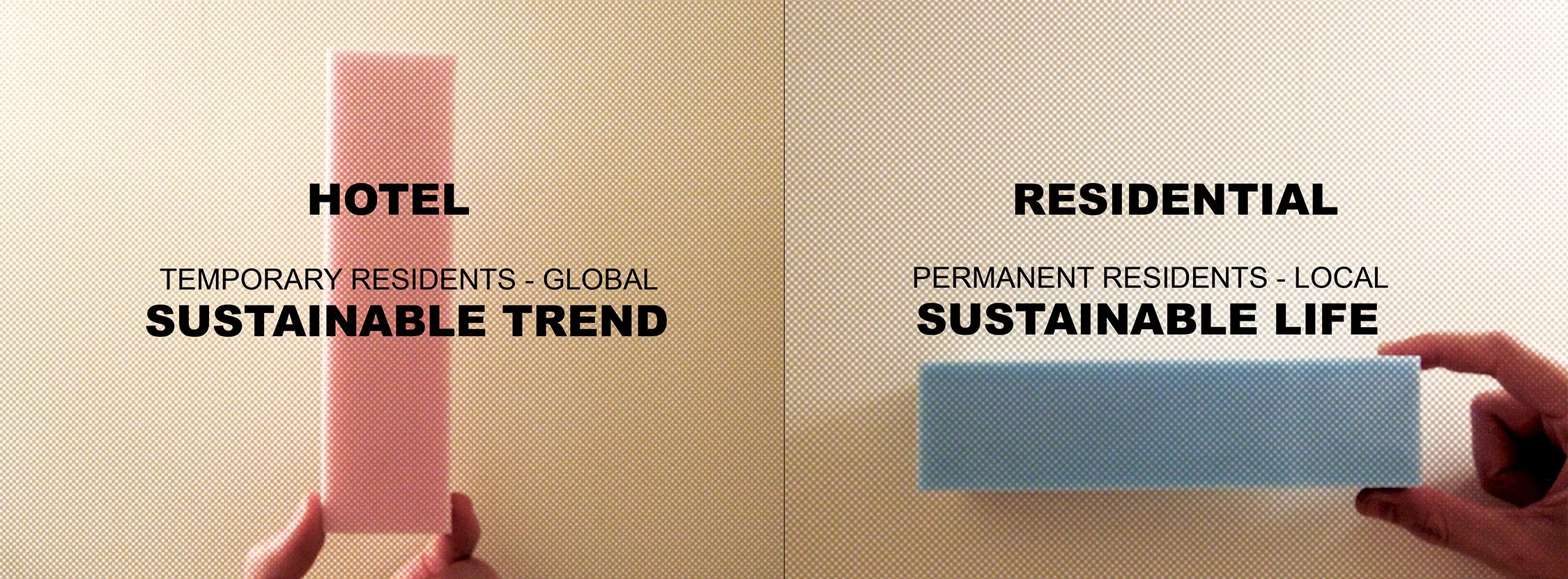 Contemporary sustainability is fraught with fallacies and consumer culture, but its foundations still have strong merit. By catering to the global sustainable trend in the boutique hotel and a more sincere notion of sustainability in the residences, a demographic spectrum is created. The hotel becomes a form of a museum where green-washed malls, galleries and the metropolitan field are on display. As hotel patrons encounter these moments they also encounter the more legitimately sustainable residents (with urban farming, communal living and modest-lifestyle). Through this lens, visitors and hotel patrons can see and consider their own role within the ensemble.